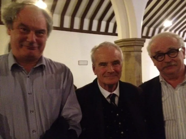 The last time I saw Max was at a concert in a church in Yorkshire, part of the North York Moors Chamber Music Festival in August of 2014. The concert, which was quite long, included Max’s Sixth Naxos Quartet. It was Max’s 80th birthday year, and I had seen him several time in London around Proms concerts which had pieces of his. Max had been very seriously ill with leukemia not too long before that, but he seemed quite healthy and, at that concert, very rested and very happy with the performance of his quartet. That happy memory is commemorated by a photo of Max, Philip Grange, and me taken after the concert.
